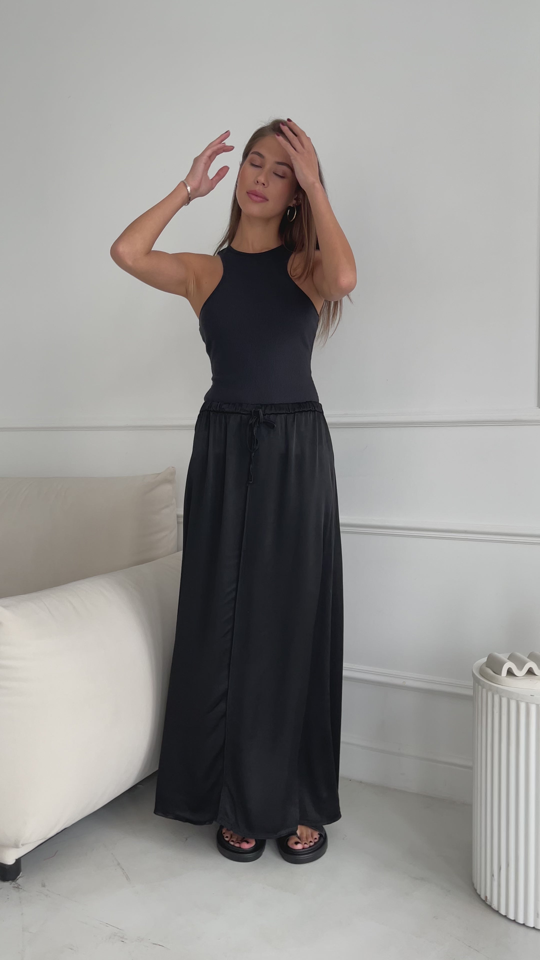 BlackPhoebe is an on trend elasticated maxi skirt in a soft satin fabric. Flowy with a luxe drape making it a perfect elevated essential this season. Versatile to team with any flat this season for a comfortable polished look