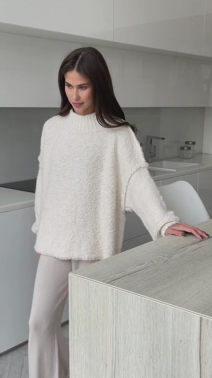 Off-WhiteJessica sweater is a relaxed fit sweater with mock-neck in an on trend wool bouclé yarn. Wear as a casual staple for a relaxed but polished look.