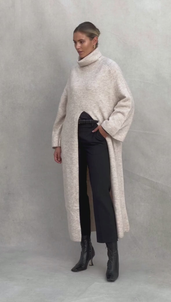 Vivienne is a perfect transitional sweater dress in a super soft and warm viscose blend yarn. Relaxed fit high neck, long sleeves and a straight-cut hem with slits in the centre. Pair with statement heels or boots for an easy to wear high impact look.